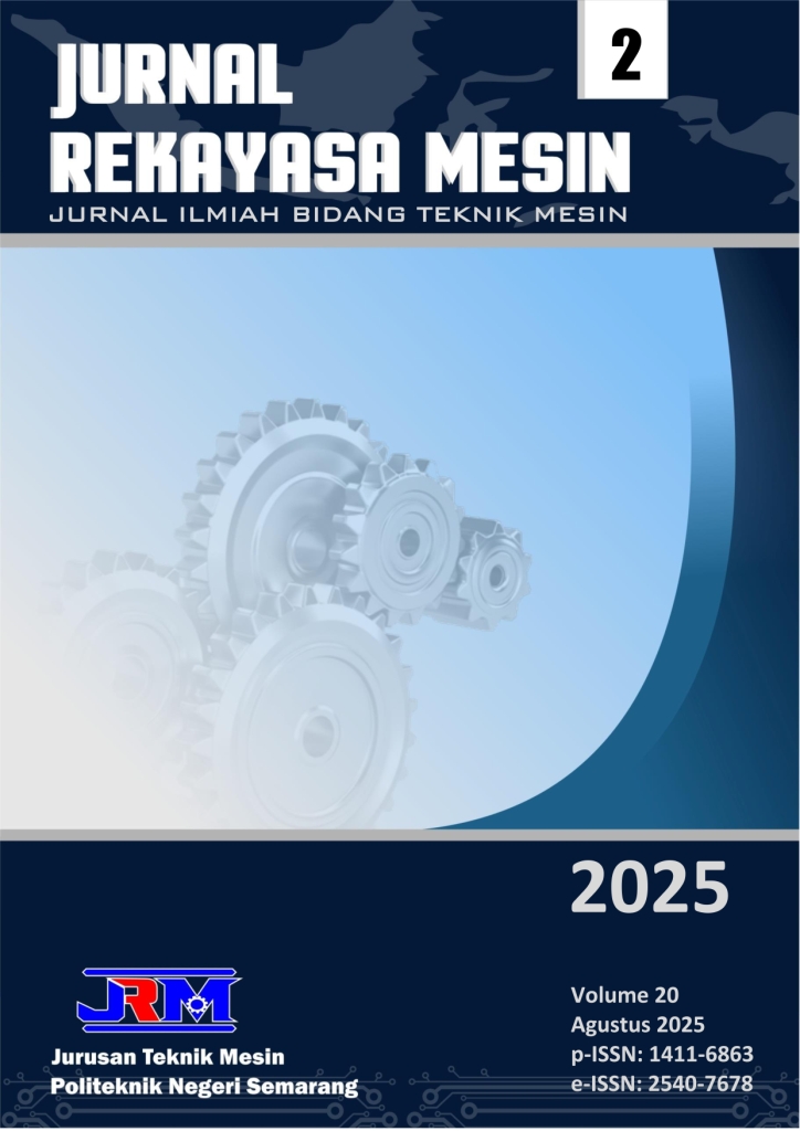 Copyright of articles that appear in Jurnal Rekayasa Mesin belongs exclusively to Penerbit Jurusan Teknik Mesin Politeknik Negeri Semarang. This copyright covers the rights to reproduce the article, including reprints, electronic reproductions, or any other reproductions of similar nature.